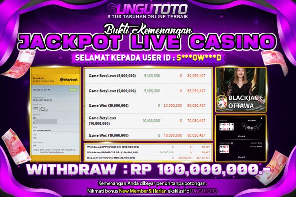 UNGUTOTO | BUKTI PEMENANG LIVE CASINO BLACKJACK OTTAWA TANGGAL 09 NOVEMBER 2025 RP. 100,000,000,. LUNAS