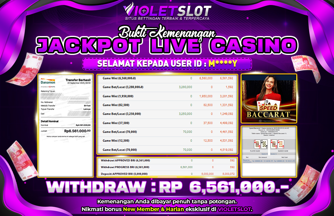 VIOLETSLOT | BUKTI PEMENANG LIVE CASINO SPEED BACCARAT TANGGAL 29 SEPTEMBER 2025 RP. 6,561,000,. LUNAS