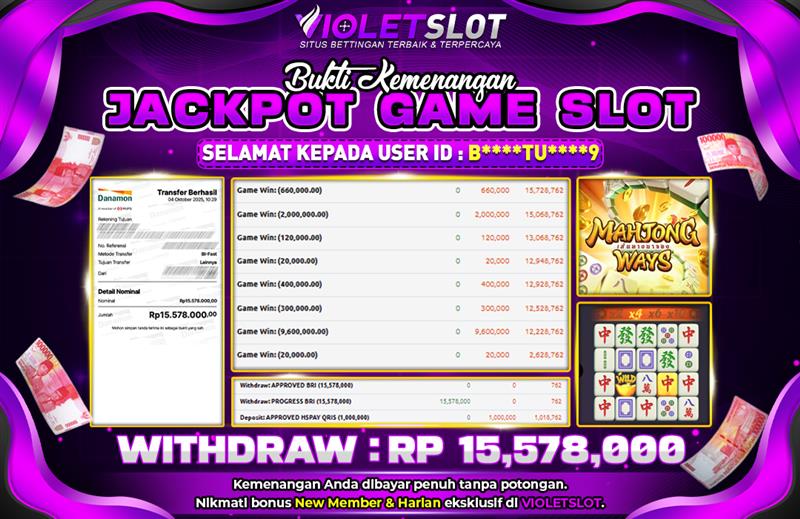 VIOLETSLOT | BUKTI PEMENANG PGSOFT MAHJONG WAYS TANGGAL 04 OKTOBER 2025 RP. 15,578,000,. LUNAS