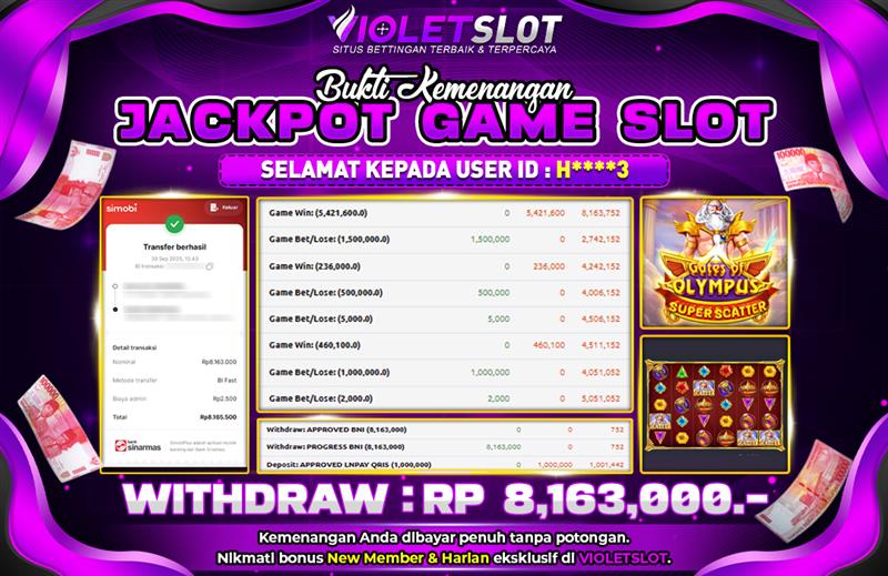VIOLETSLOT | BUKTI PEMENANG PRAGMATIC GATES OF OLYMPUS SUPERSCATTER TANGGAL 30 SEPTEMBER 2025 RP. 8,163,000,. LUNAS