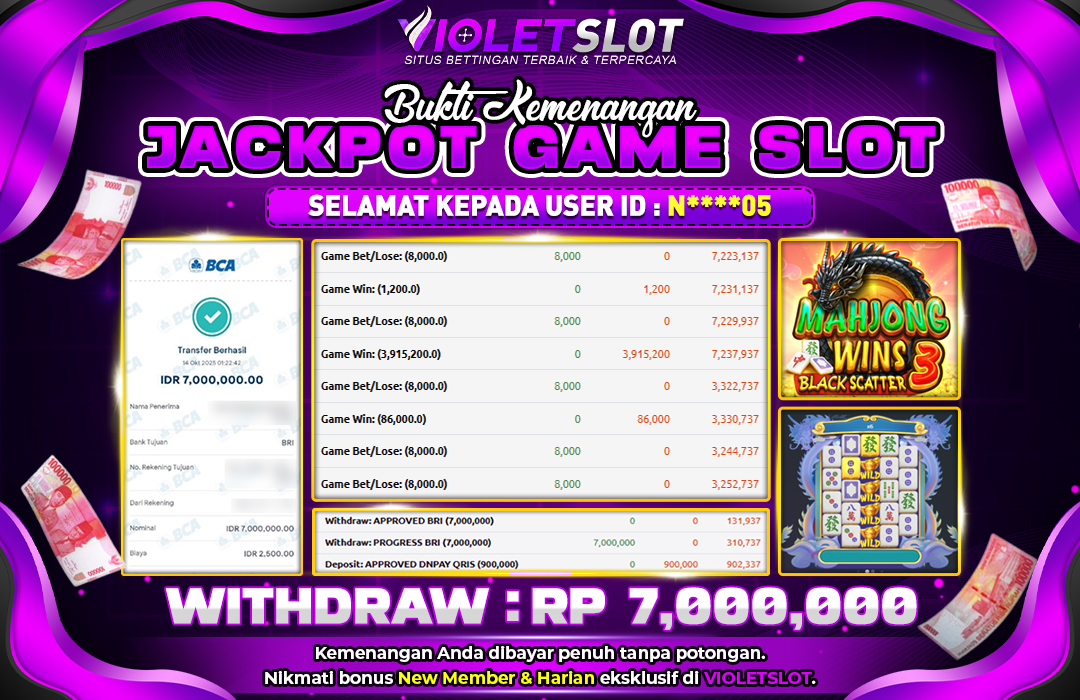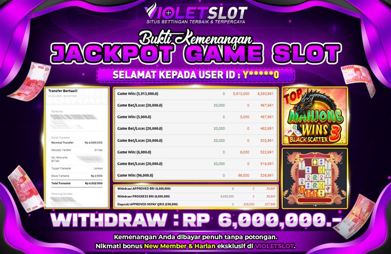 VIOLETSLOT | BUKTI PEMENANG PRAGMATIC MAHJONG WINS 3 BLACKSCATTER TANGGAL 06 OKTOBER 2025 RP. 6,000,000,. LUNAS